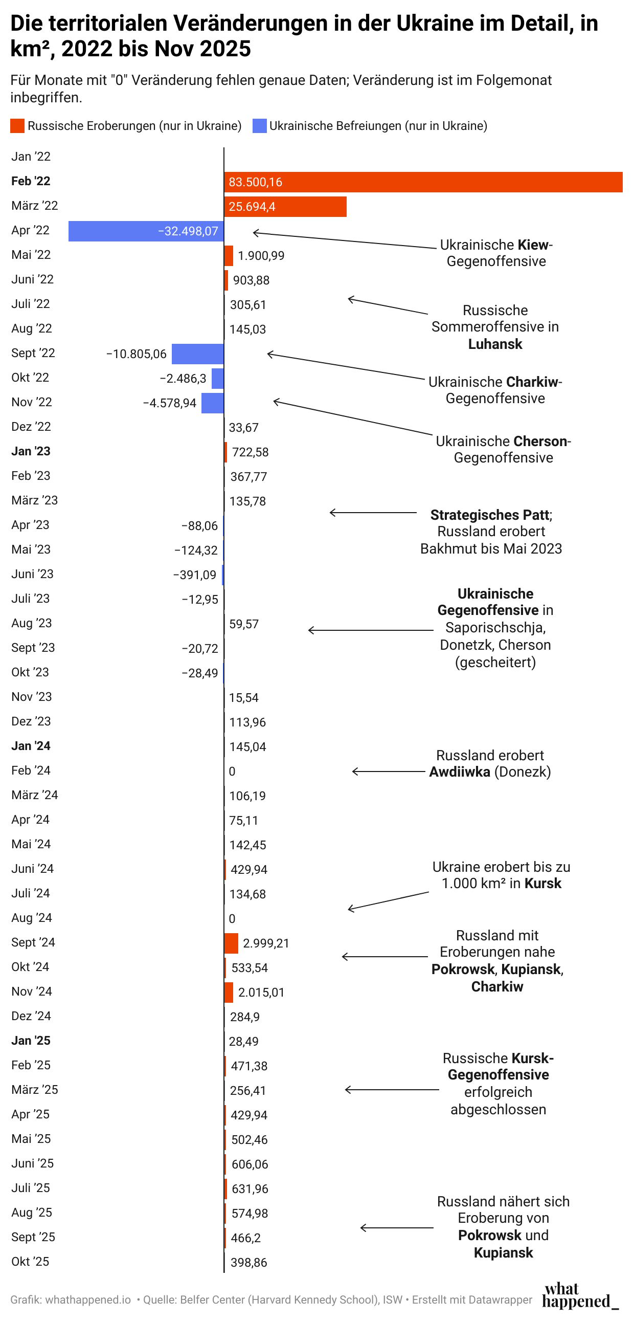 Auffällig ist dabei, dass das Tempo der russischen Gebietsgewinne stetiger geworden ist. In den ersten acht Monaten 2024 gelangen Russland nur 1.000 km² Fortschritt, etwas mehr als die Gesamtfläche Berlins. In den ersten acht Monaten 2025 waren es 5.680 km², also das 5,6-Fache. Das deutet darauf hin, dass die russische Kriegsführung effektiver oder die ukrainische Verteidigungsfähigkeit gesunken ist – oder Russland einfach mehr Soldaten und Material investiert. Bekannt ist, dass Russlands relative (wenn auch nicht absolute) Luftüberlegenheit einen großen Beitrag zum Invasionsfortschritt leistet.