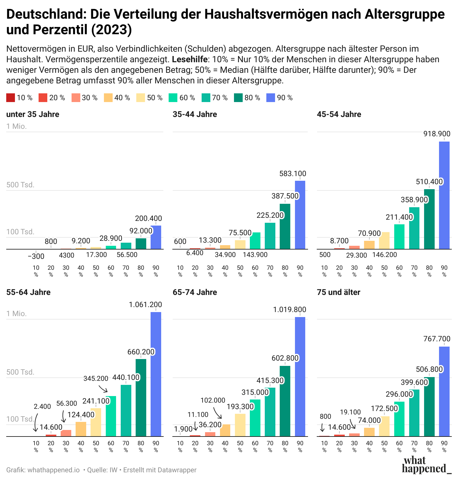 Gut zu wissen: Unsere Grafik oben zeigt die Vermögensverteilung nach Alterskohorte. Der gelbe Balken für jede Kohorte zeigt ihren Median an. Die Rentnergenerationen haben mit 193.300 EUR bzw. 172.500 EUR (ab 75 Jahren) Median-Haushaltsvermögen ein vergleichsweise hohes Vermögen, welches sie zudem vermutlich auf weniger Personen im Haushalt aufteilen als die Alterskohorten davor – zugleich muss darin für viele Haushalte die Immobilie berücksichtigt werden, welche sich nicht einfach für den Lebensunterhalt liquidieren lässt.
